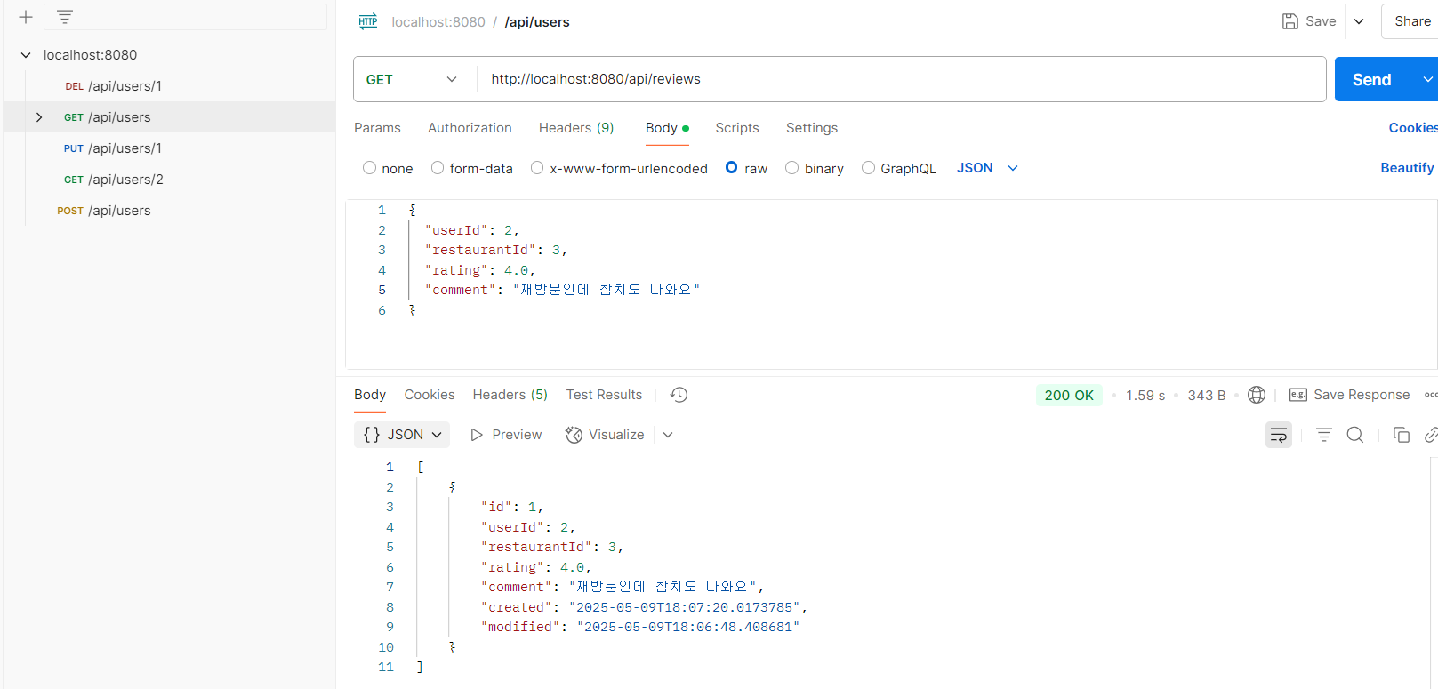 - 메서드명, 변수명 통일: createUser, createRestaurant, createReview