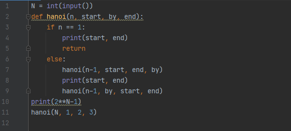 하나 남은 원판을 시작점에서 도착점으로 옮기고 => print(start, end) #원판하나를 옮긴 행위