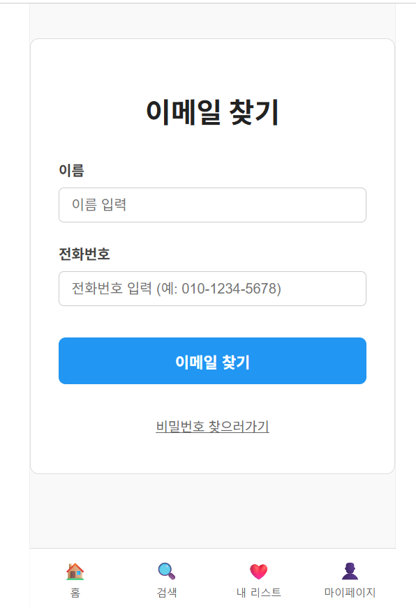 - 사용자가 본인의 이름 + 전화번호를 입력하면, 가입된 이메일을 조회하여 반환