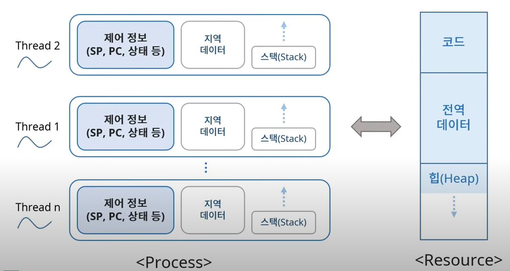 이 때 프로세스가 이 자원을 제어하는 작업을 Thread로 표현된다.