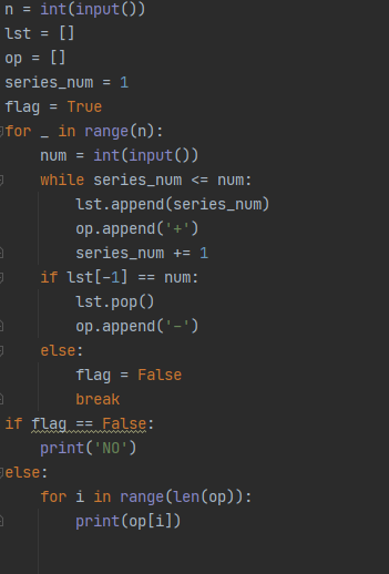 1부터 n까지에 수에 대해 차례로 [push, push, push, push, pop, pop, push, push, pop, push, push, pop, pop, pop, pop, pop] 연산을 수행하면 수열 [4, 3, 6, 8, 7, 5, 2, 1]을 얻을 수 있다.