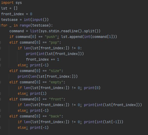 결국 큐 입장의 가장 앞을 가르키는 front_index를 추적하면서 리스트를 슬라이싱 하여,