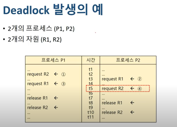 - Deadlock state => 프로세스가 발생 가능성이 없는 이벤트를 기다리는 상태