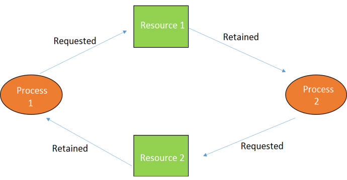 이처럼 두가지 프로세스가 서로 다른 자원을 요구하면서 그 요구하고있는 자원을,