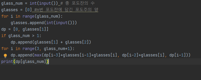 dp[i] = dp[i-3] + glasses[i-1]+[glasses[i] or dp[i-2] + glasses[i] or dp[i-1] 중에서