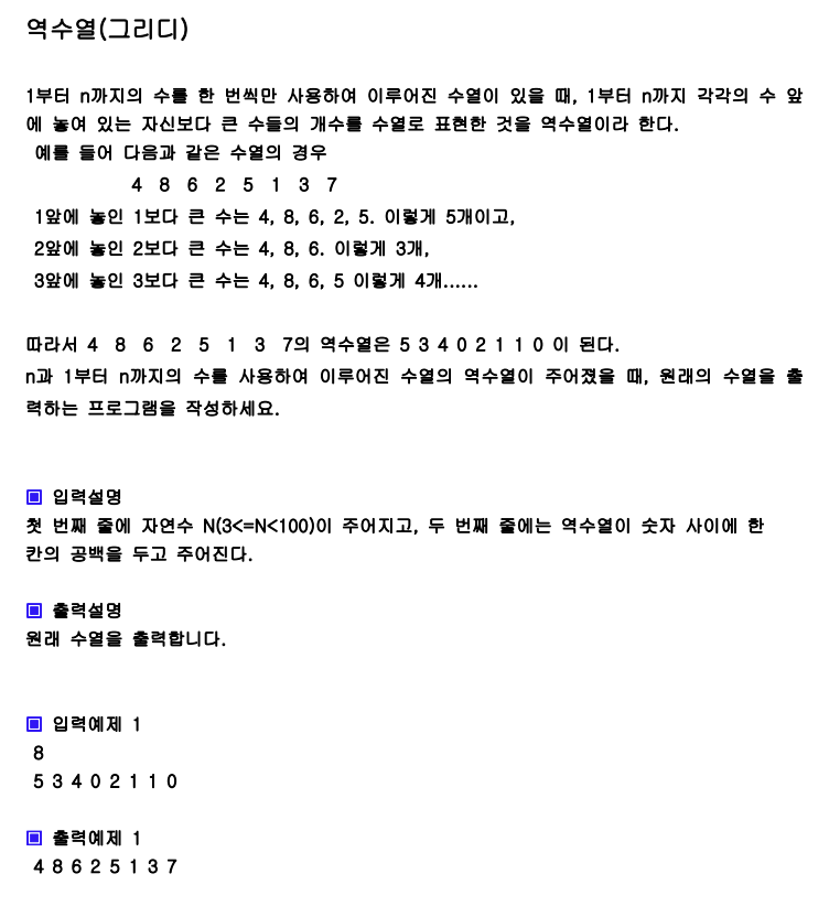 cnt 와 역수열의 원소값이 같아지면 그때의 i+1 값을 원수열에 넣어주고 다음 반복문을 통해