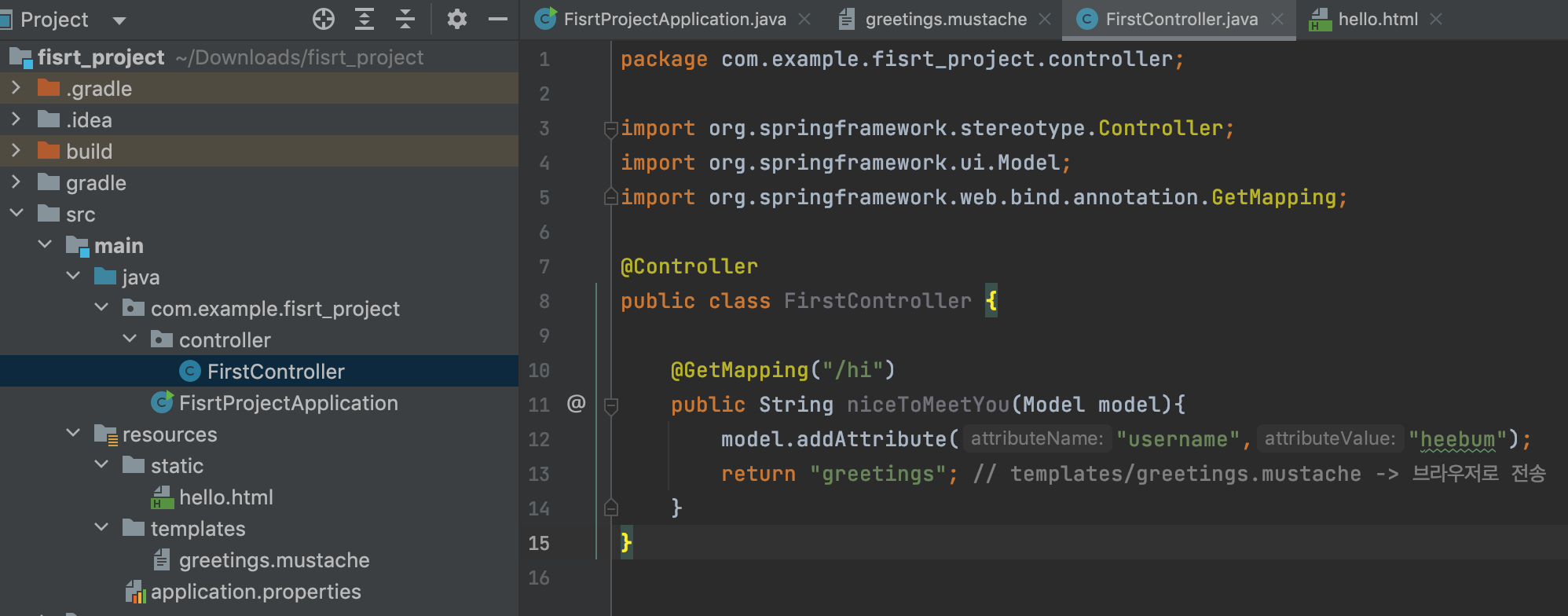 메서드에 리턴값으로 mustache파일의 이름만 적으면 얘가 templates 안에 이 파일을 찾아